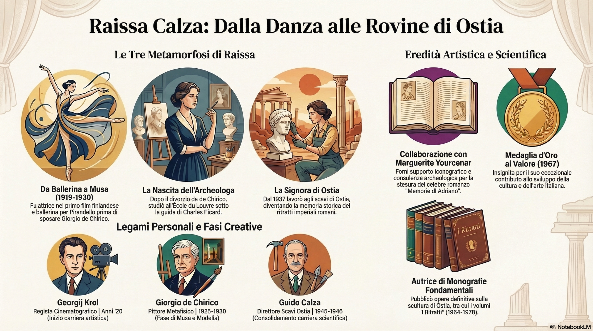 Dopo la Rivoluzione d'Ottobre, Raissa si reinventa nel cuore del mondo intellettuale italiano, contribuendo alla cultura di Roma come ballerina, musa e poi archeologa. Ostia diventa la sua patria elettiva, dove con dedizione e tenacia lascia un segno indelebile nella ricerca archeologica, diventando una figura chiave nel panorama culturale italiano del dopoguerra.